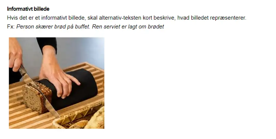 Alternativt kan du beskrive, hvad der står på billedet i en ALT-tekst, men overvej nøje om en person, der ikke kan se billedet, får det fulde udbytte af din tekst:
