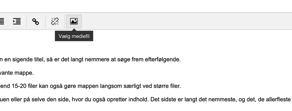 Langt de fleste redaktører lægger billeder og filer ind via editoren (redigeringsværktøjet), dvs. der hvor du også lægger tekst ind på en side.